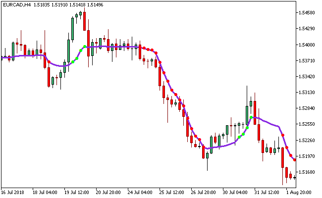The AMKA Metatrader 5 forex indicator was created by Perry Kaufman as an adaptive moving average with indicative points placement based on the standard mean-square deviation.