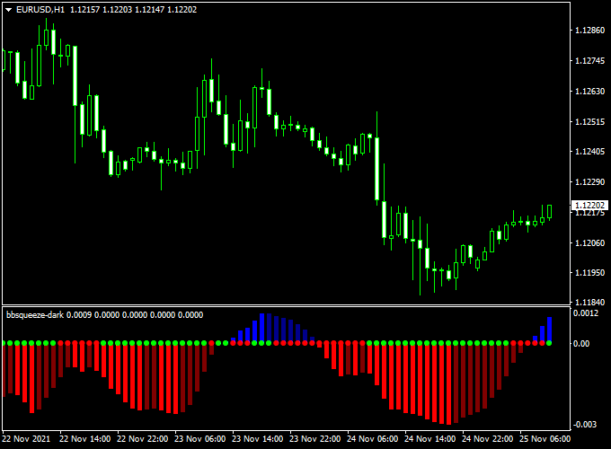 Download the “bbsqueeze-dark.mq4” indicator for Metatrader 4