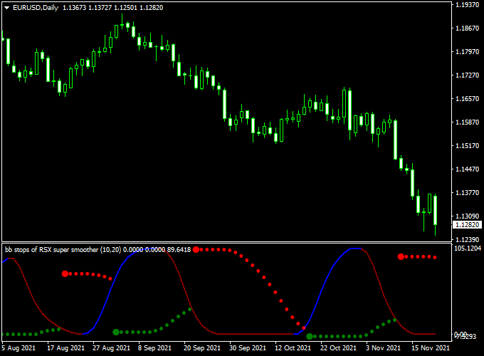 The BB Stops Of RSI Super Smoother indicator is always active in the market, either with a buy or sell position.