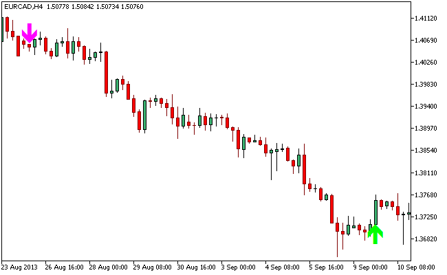 Sell Signal: Go short when the magenta downward pointing arrow of the Bykov Trend Alert Metatrader 5 forex indicator gets aligned above the candlesticks.