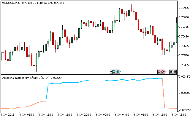 On EURUSD M30, price created a Doji candle at a support level and the Doji Detector marked it with a green bar.