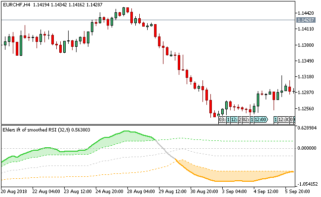 The EUR/CHF H4 chart below displays the Ehlers Fisher Smoother RSI Metatrader 5 forex indicator in action.