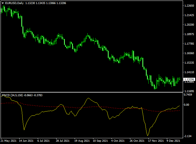 The FNCD indicator is bullish when the yellow line crosses above the red dotted line and remains above zero, and bearish when it crosses below the red dotted line and stays below zero.