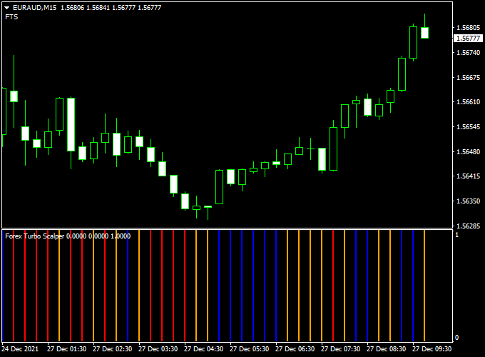 - Look for a blue histogram bar on the Forex Turbo Scalper, signaling a short-term buy opportunity.