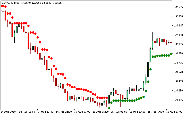 Sell Signal: Go short when the red colored dots of the indicator get aligned above the candlesticks.