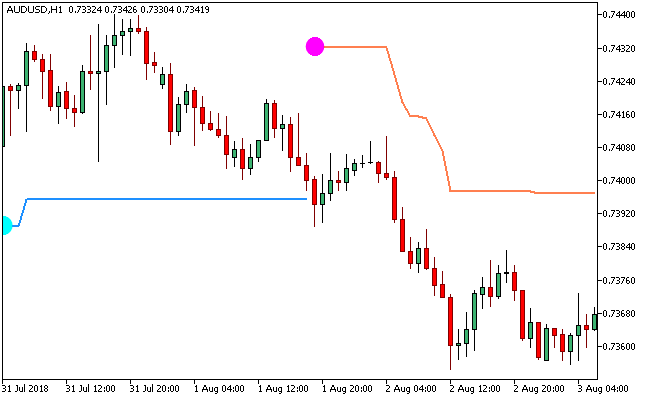 The magenta signal dot is attached to the coral colored line, and gets placed above the candlesticks, while the aqua signal dot is attached to the dodger blue lines, and gets placed below the candlesticks.