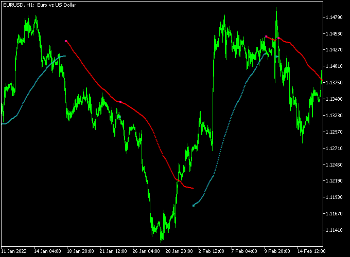 The indicator opens up in the main chart window as a light-blue/red colored signal line and is always active in the market, either with a buy or sell trade.